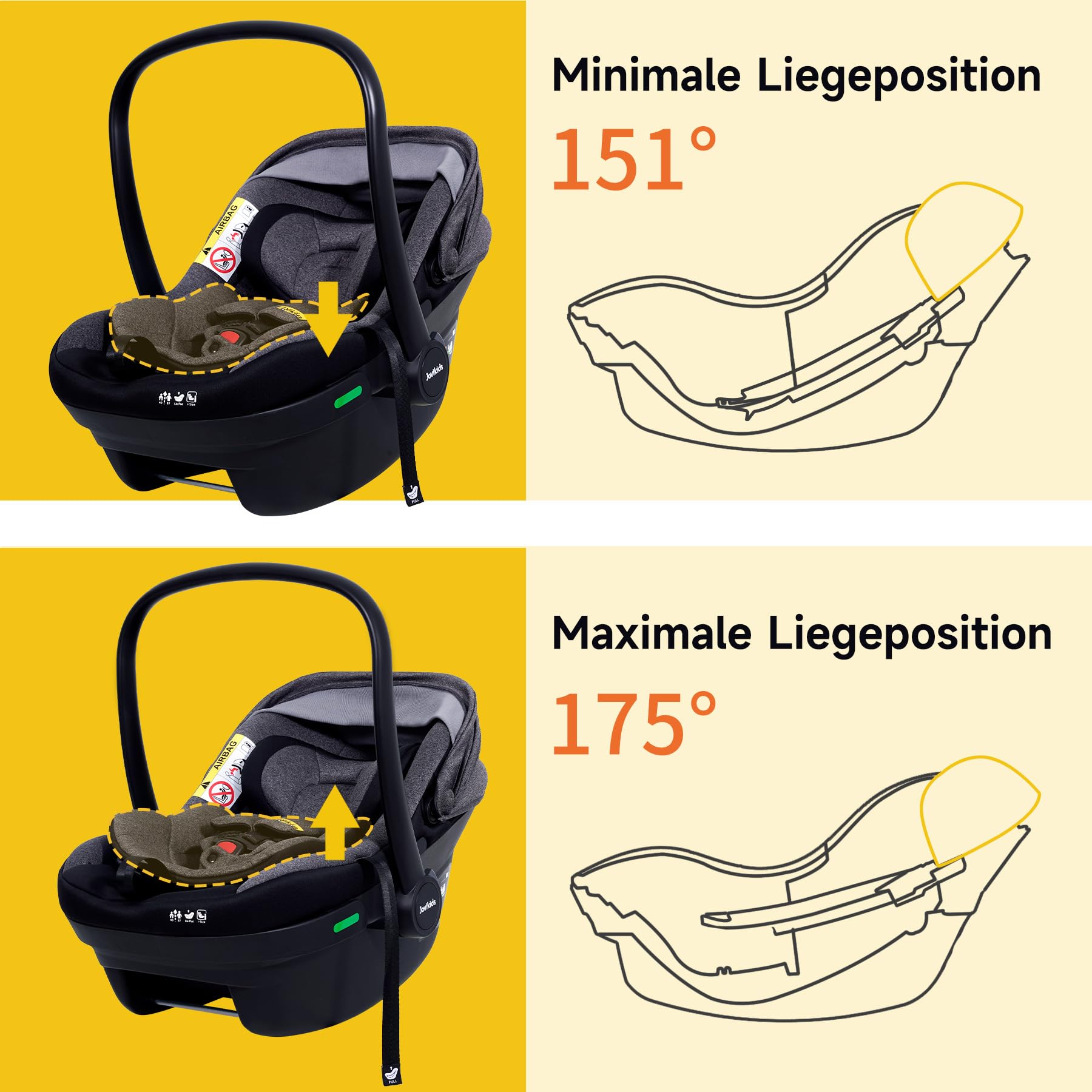 - 3-stufiger Tragegriff:In der ersten Position steht der Griff senkrecht zum Boden, was das Tragen der Babyschale durch die Eltern erleichtert.In der zweiten Position liegt der Griff an der Rückenlehne des Autositzes an, sodass Eltern leichter mit dem Baby in der Babyschale interagieren können.In der dritten Position berührt die Oberseite des Griffs den Boden und bildet ein stabiles Dreieck, um die Babyschale zusätzlich zu stabilisieren.