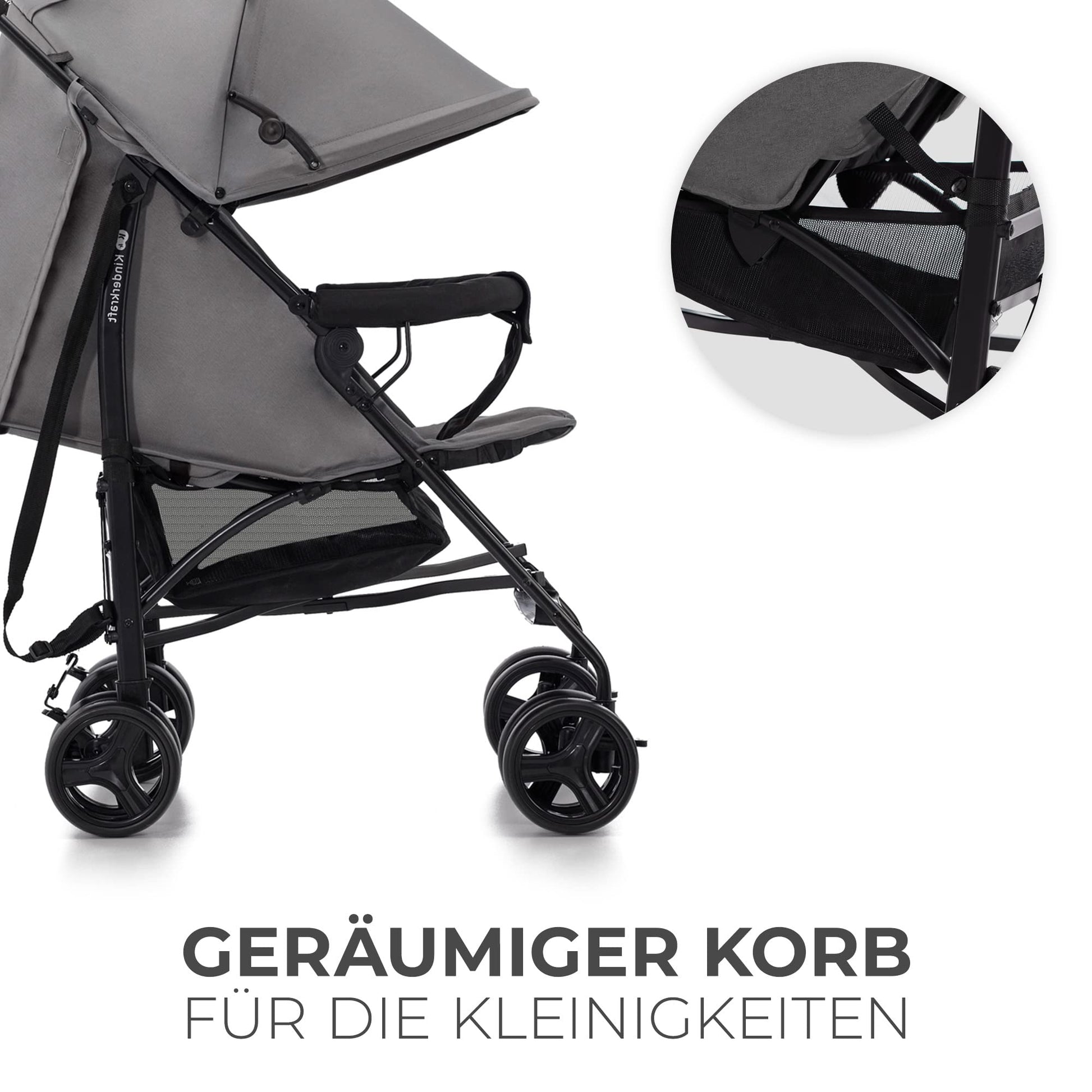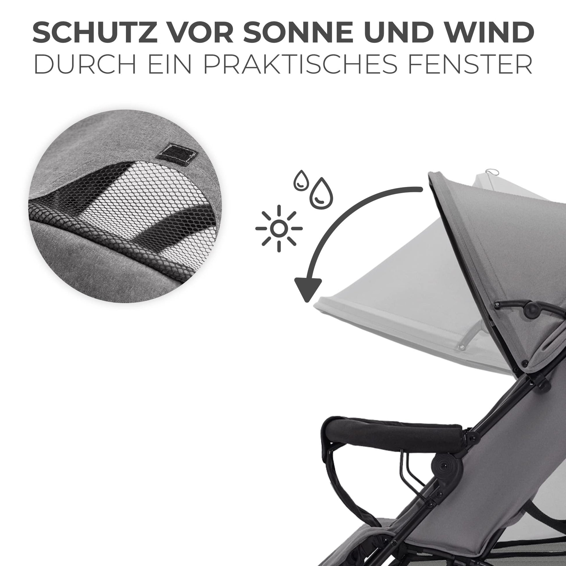 Das ausklappbare Verdeck schützt das Kind bei Spaziergängen vor Wind und Nieselregen und spendet Schatten. In dem Verdeck gibt es ein Fenster für den Blickkontakt der Eltern mit dem Kind. Der Kinderwagen hat einen bequemen Tragegriff.