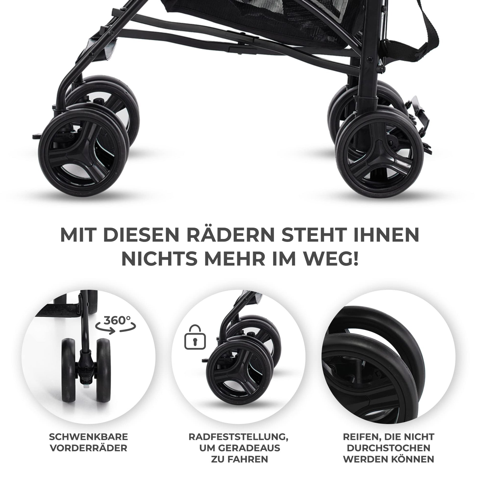 - ✅ PRAKTISCH: Reifen aus Schaumstoff, die nicht durchstochen werden können. Die Vorderräder sind um 360 Grad schwenkbar und haben einen Feststellmechanismus für die Geradeausfahrt. Reifen mit Dämpfung und eignen sich gut für unebene Pflastersteine.